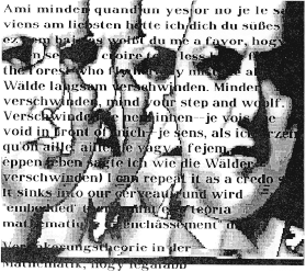 There are probably few North Americans who read all four languages in which this book is written. In my case, English is my basic language; I don't have trouble with the French; have difficulty and need a dictionary for the German; while the Hungarian is completely opaque even a dictionary would be of little use since my ignorance of Hungarian grammar is complete. But knowledge of all four languages is not necessary to appreciation of this book. Instead, the four languages act as difficulty levels between which the reader switches while reading. Passages in unintelligible languages act as a sort of sound poetry, and the text as a whole moves from clarity to complete abstraction at varying speeds. Here is a lyrical passage: