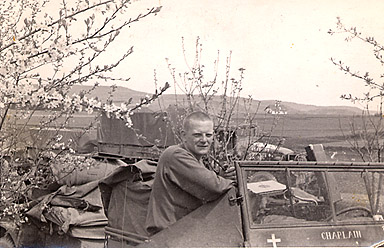 His duties, from performing religious services to burying the dead, required that he be at least as mobile as the troops he served. The photo above shows him in his jeep, which he named Yorick after a figure in Shakespeare's Hamlet. Carl's tiny-print, Army issue copy of the works of Shakespeare was the book which accompanied Carl's Bible through the war.