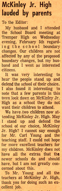 Carl saw his professional life as he saw other activities: a set of balances. The balances worked through changing emphasis. If one period of his career involved ministering to spiritual needs, another part had to deal with more tangible situations. These sets of balances should in turn be integrated with leisure and family activities. He felt that seeking balances such as these would not only improve each component, but would make him a better person and lead to a happier life. His life did, indeed, seem to demonstrate that he was right.Acting as a junior high school principal was not the job he liked most during his professional career, but it was one that he felt needed to be done. The school system in Kenosha had its share of problems, and the 1960s was an era when many of them pushed themselves more prominently into the forefront of public life than they had during the previous decade. The interrelated intricacies of districting, demographics, and racial issues seemed most in need of attention, and he worked steadily, though often quietly, to redress unfair situations for African American students, children from troubled homes, and students with problems which the system tended to ignore or use as political footballs. Though responses could be considerably more angry, the following laudatory letter to the editor of the Kenosha News gives something of the feel of the era, and the position of McKinley at the time. References to choice, boundaries, and quality of schools tend to be code for issues of socio-ecconomics, race, and other fault lines..