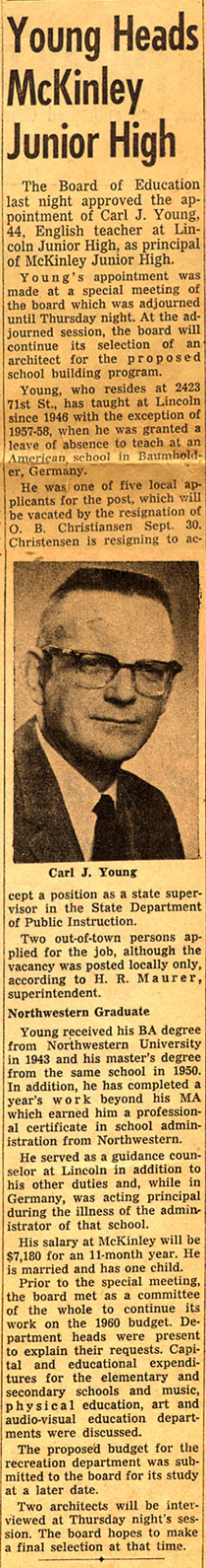 Carl saw his professional life as he saw other activities: a set of balances. The balances worked through changing emphasis. If one period of his career involved ministering to spiritual needs, another part had to deal with more tangible situations. These sets of balances should in turn be integrated with leisure and family activities. He felt that seeking balances such as these would not only improve each component, but would make him a better person and lead to a happier life. His life did, indeed, seem to demonstrate that he was right.Acting as a junior high school principal was not the job he liked most during his professional career, but it was one that he felt needed to be done. The school system in Kenosha had its share of problems, and the 1960s was an era when many of them pushed themselves more prominently into the forefront of public life than they had during the previous decade. The interrelated intricacies of districting, demographics, and racial issues seemed most in need of attention, and he worked steadily, though often quietly, to redress unfair situations for African American students, children from troubled homes, and students with problems which the system tended to ignore or use as political footballs. Though responses could be considerably more angry, the following laudatory letter to the editor of the Kenosha News gives something of the feel of the era, and the position of McKinley at the time. References to choice, boundaries, and quality of schools tend to be code for issues of socio-ecconomics, race, and other fault lines..