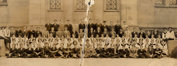 Above: Bradford students at Simmons Library. Below: Detail of above, showing Carl as a high school student.Carl's most important athletic activities were swimming, baseball, and basketball. He felt most confident in his abilities in the latter, and went on to become the captain of his seminary's basketball team. Baseball, however, became his favorite spectator sport in later life. As much as he loved to read and engage in sports, this was the Depression, and he had to supplement the family's income. His first job was at Oscar Ogren's Dinner, where he earned the princely sum of 35 cents a week plus free meals. During his last two summers in high school, and between semesters at college, he worked at American Brass.