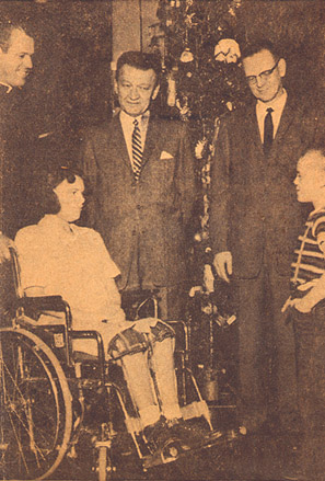 Leaders of the 1960 March of Dimes campaign: Fr. Edmund Olley, William Lipman, and Carl Young. The children from the Orthopedic School are Ruth Cramer and Randy Wix.