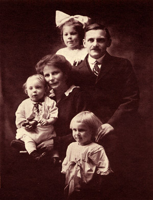 Anna and Axel moved to West Allis after their wedding. The family moved to Kenosha when Carl was two, so this picture, probably taken in 1916, shows the family in West Allis. Their eldest child, Hildur, appears at the top of the photo. Moving clockwise, we see Axel, Ann, Carl, and Anna.