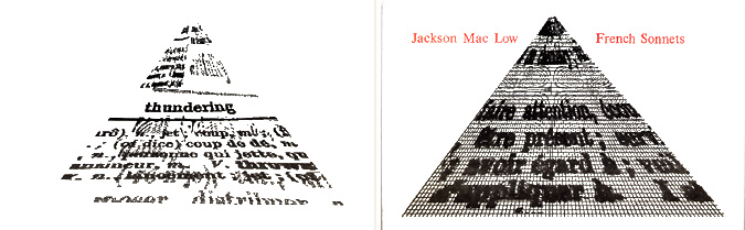French Sonnets, by Jackson Mac Low. Cover graphics by Anne Tardos. 8" x 5"; 32 pp; perfect bound. 1989. Click here to go to an essay on books by Jackson Mac Low Click here to go to Some Volumes of Poetry, Part 1